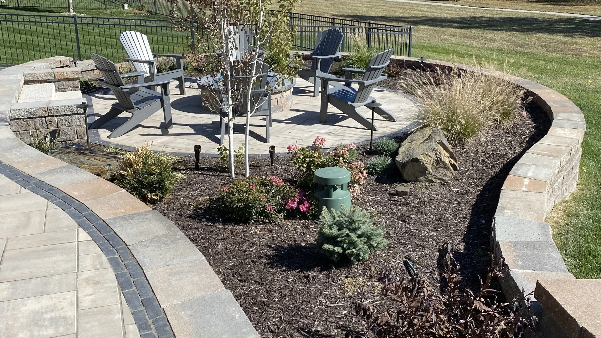 Landscape design, fire pits, full-service maintenance, lawn care, irrigation repairs, and other services are offered.